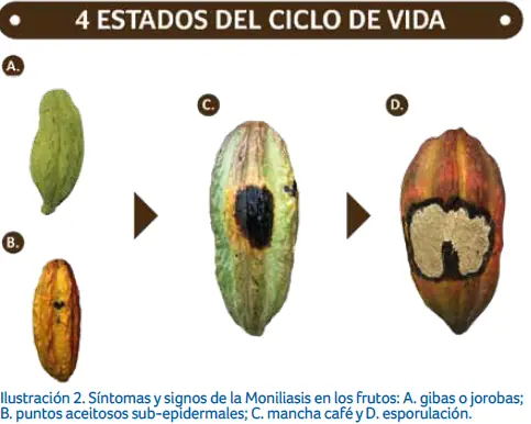 Sin lugar a dudas, la enfermedad del fruto de cacao llamada “Moniliasis”, cuasada por el patogeno Moniliophthora roreri, ha sido considerada como la principal causa de los bajos rendimientos del cultivo en todas las regiones productoras de Colombia y, como consecuencia, del abandono de extensas áreas, tal como ocurrió con las 4.000 hectáreas sembradas en la zona de Urabá en la década del 70, provocando grandes frustraciones a los pequeños y medianos inversionistas. Grandes esfuerzos del sector público, gremial y privado se enfocaron en la tarea de estudiar mecanismos de control de esta agresiva enfermedad, con la cooperación internacional especialmente del Reino Unido, cuyos resultados positivos se comprobaron en regiones como el Magdalena Medio Santandereano, Bajo Cauca Antioqueño y en la misma zona de Urabá entre 1981 y el año 2019.